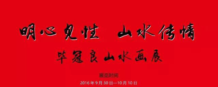 “明心见性 山水传情——毕冠良山水画展”将于2016年9月30日——10月10日在河南新乡艾地书画艺术馆展出。这次展出毕冠良老师精品山水40余幅,欢迎各界朋友前来艾地书画艺术馆参观交流。本次展览得到帝隆实业集团、豫飞重工集团、新乡电视台、新乡市上膜有限公司、鑫龙房地产开发有限公司、河南万业实业有限公司等企业的大力支持。